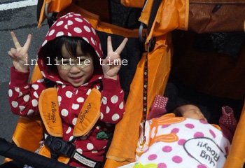 ちーちゃんはもうベビーカー卒業の年齢で、最近はもうベビーカーなんか乗りたがらないのに、今日はみーちゃんが乗ってるから自分も隣に乗りたい!!と^^;